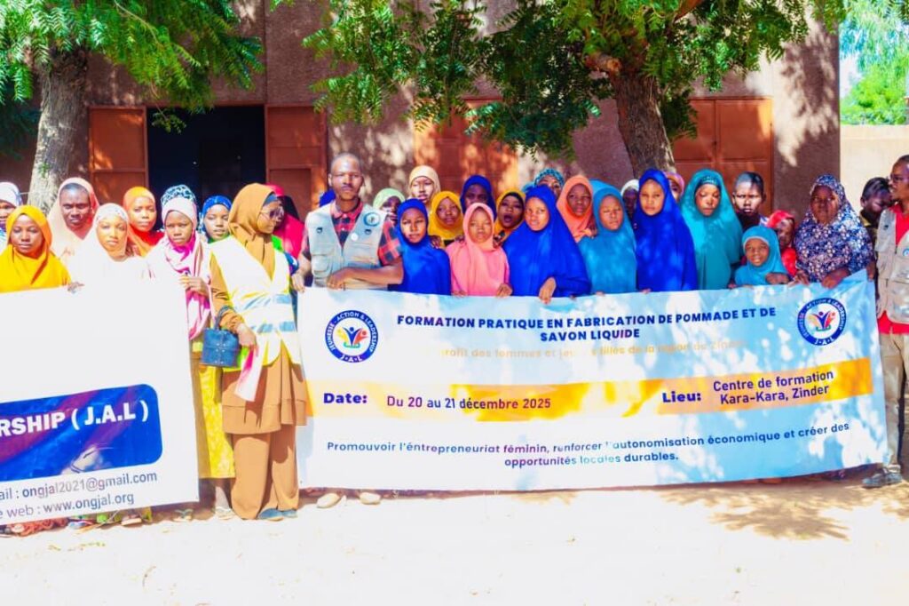 Dans le cadre de ses actions en faveur de l’autonomisation économique des femmes et des jeunes au Niger, l’ONG Jeunesse, Action et Leadership (JAL) a initié une formation en fabrication de pommade et de savon liquide au profit de trente (30) femmes et jeunes filles issues de groupements féminins locaux dans la région de Zinder. Cette initiative s’inscrit dans une dynamique de valorisation des savoir-faire locaux, de promotion de l’auto-emploi et de développement d’activités génératrices de revenus durables.